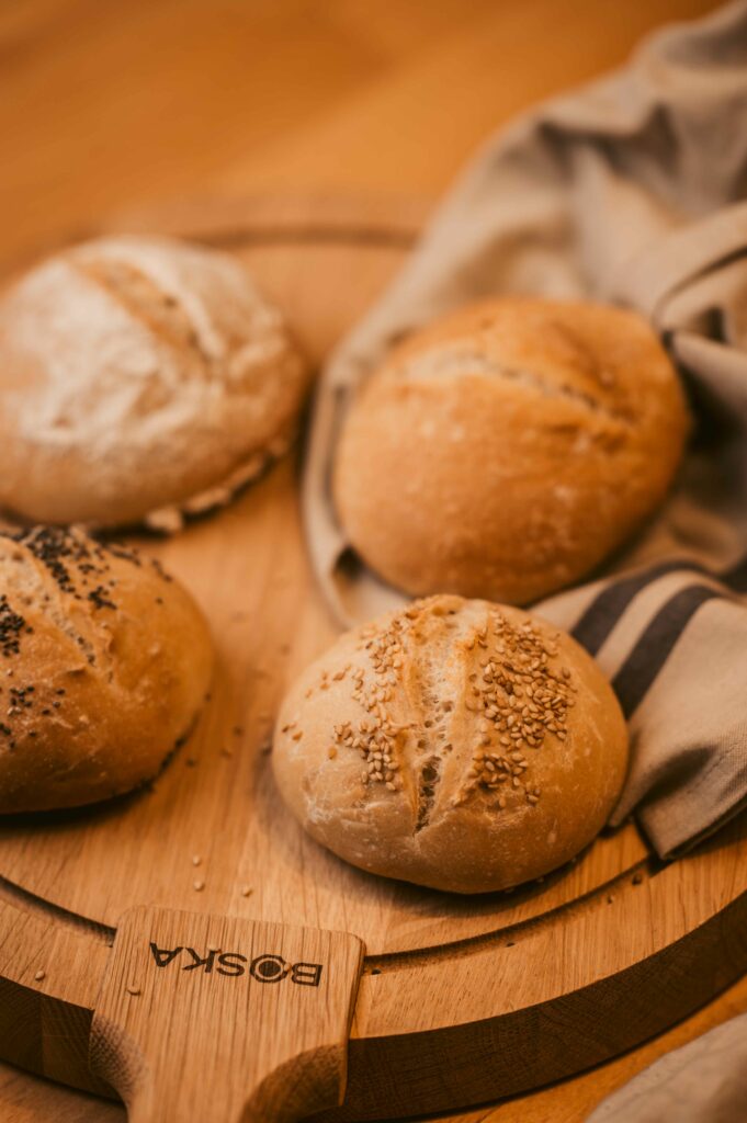 Alle Zutaten zusammen verkneten und den Teig anschließend für 1 Stunde bei Raumtemperatur ruhen lassen. Anschließend Brötchen von 100g formen und diese für 2-3 Stunden bei Raumtemperatur aufgehen lassen. Anschließend die Brötchen bei 230 Grad für 20-25 Minuten backen.
